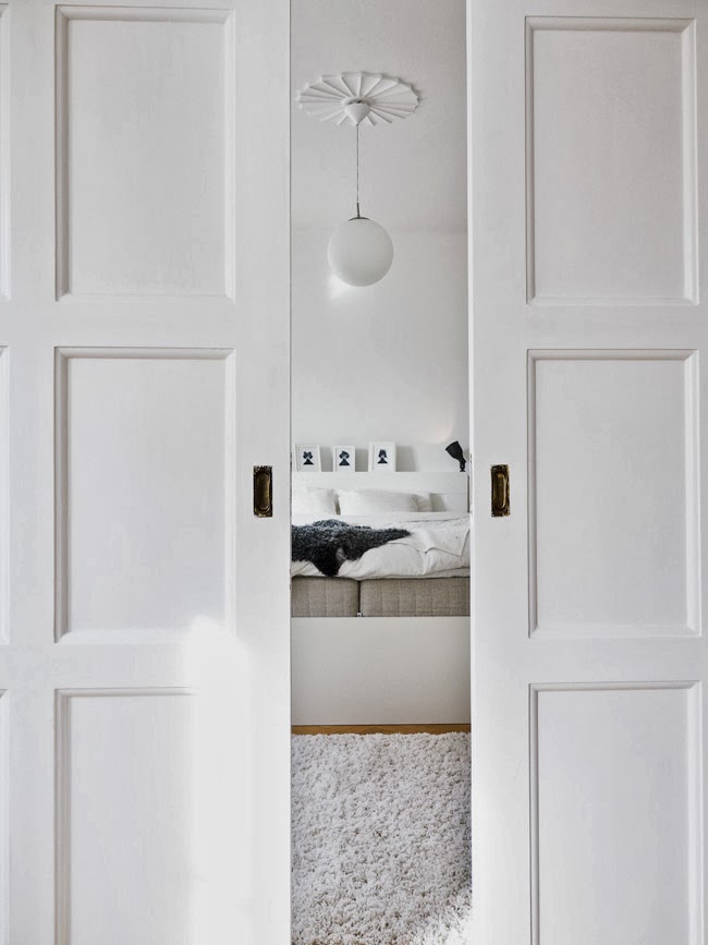 Hello! I thought we'd head to my husband's home town of Helsingborg, Sweden today and this beautiful home. The house was built in 1928 and was bought from an old lady who'd lived their for 60 years. Josefin and her husband Christian lovingly renovated the house from scratch just in time for the birth of their little baby boy Melker this Summer. And with fantastic results! I love the huge double doors, the touches of mid-century, and the way bold fabrics and textiles add to an otherwise all white room. Oh and spot the flamingo!